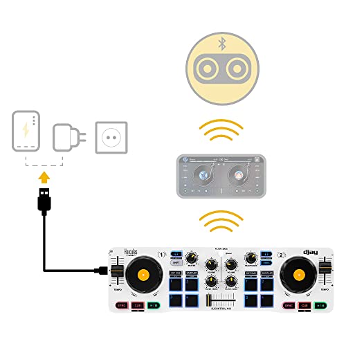 Steuert die djay-App, die kostenlos und für uneingeschränkte Nutzung auf Android und iOS verfügbar ist (Sie müssen nicht für die App bezahlen: Schließen Sie einfach das Pop-up-Fenster, das Sie auffordert, auf djay Pro upzugraden, wenn die App gestartet wird) DJ Controller Mix + Kopfhörer: DJ Controller für Android- und iOS Smartphones und Tablets 2 Jog Wheels zum Mixen und Scratchen Fader Drehregler und Pads für Samples und Effekte DJ-App wird per Bluetooth mit dem DJ Control Mix gesteuert Alle essentiellen DJ Funktionen wie Cue-Points Samples Loops etc Live-Monitoring über Kopfhörer und an Boxen möglich Splitter-Kabel ermöglicht Anschluss von Kopfhörer/Boxen Inklusive klappbaren Smartphone-Ständer Hinweis: Zur Nutzung des Kopfhörers benötigt Ihr Smartphone einen Kopfhörer-Anschluss Der DJ Control Mix ist ein kabelloser 2-Deck DJ Controller der speziell zur Verwendung mit iOS und Android Smartphones / Geräten entwickelt wurde. Der Controller wird per Bluetooth mit einem Mobilgerät verbunden und steuert die zugehörige kostenlose DJ-App.Die Stromversorgung läuft über das USB Kabel (ohne Netzteil). Verbinden Sie den Controller mit einer Powerbank oder einem Handy-Ladegerät um überall zu Mixen.Mit den Jogwheels kann gescratched werden, wobei die Fader, Drehregler und Pads alle essentiellen DJ-Funktionen ermöglichen wie das Abfeuern von Samples, Cue-Points und das Einspielen von Loops und Effekten. Hinweis:Steuert die djay-App, die kostenlos und für uneingeschränkte Nutzung (Sie müssen nicht für die App bezahlen: Schließen Sie einfach das Pop-up-Fenster, das Sie auffordert, auf djay Pro upzugraden, wenn die App gestartet wird)+ keepdrum Kopfhörer Lieferumfang: DJControl Mix USB-Kabel (USB-C auf USB-A) Zusammenklappbarer Ständer für Smartphone/Tablet Splitter-Kabel Kopfhörer