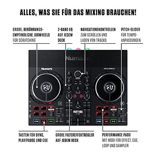 Numark Party Mix Live + HF 125 – DJ Controller Set mit eingebauten Lautsprechern, Lichtshow & Mixer und DJ Kopfhörer