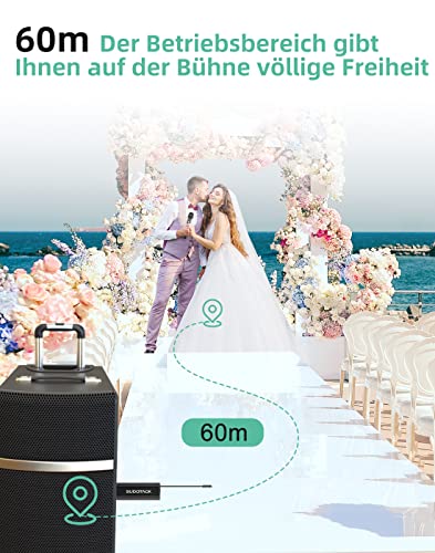 FREIE BEWEGUNG: Das Kabelloses Mikrofon mit einer Reichweite von bis zu 60 m, mit dem Sie sich frei im Raum bewegen oder arbeiten können. Mit stabiler UHF-Technologie können Sie bis zu 5 Sätze drahtlose Mikrofonsysteme anschließen und 10 Personen können sie gleichzeitig auf der Bühne nutzen, ohne gegenseitige Störungen.